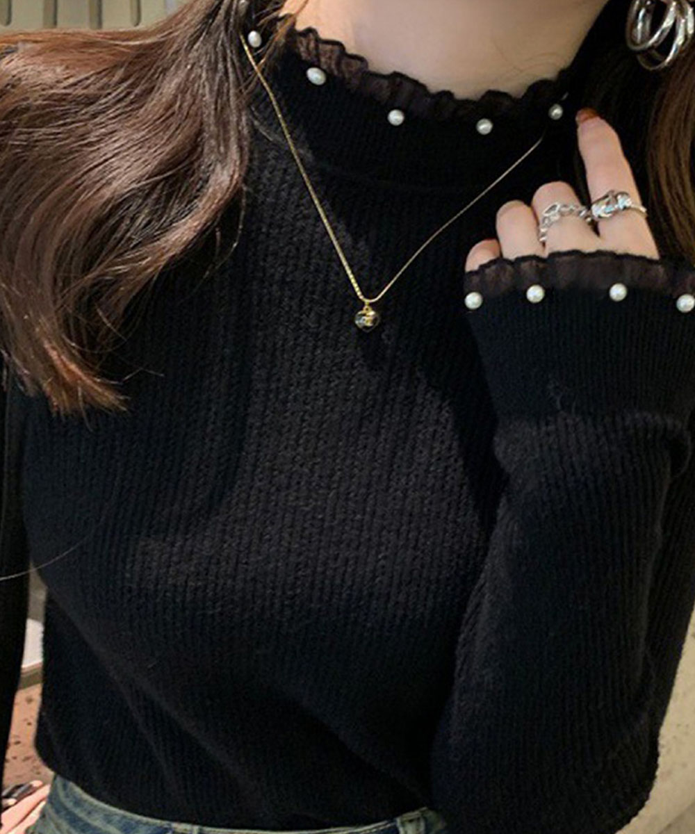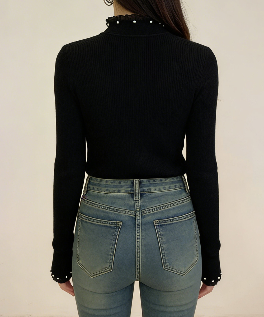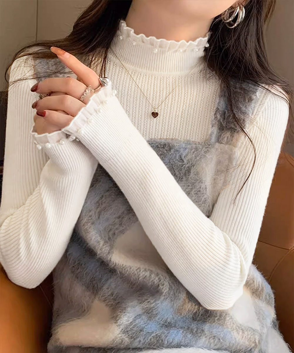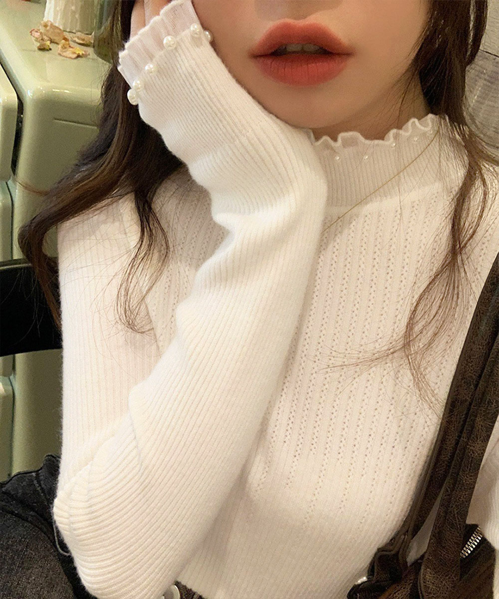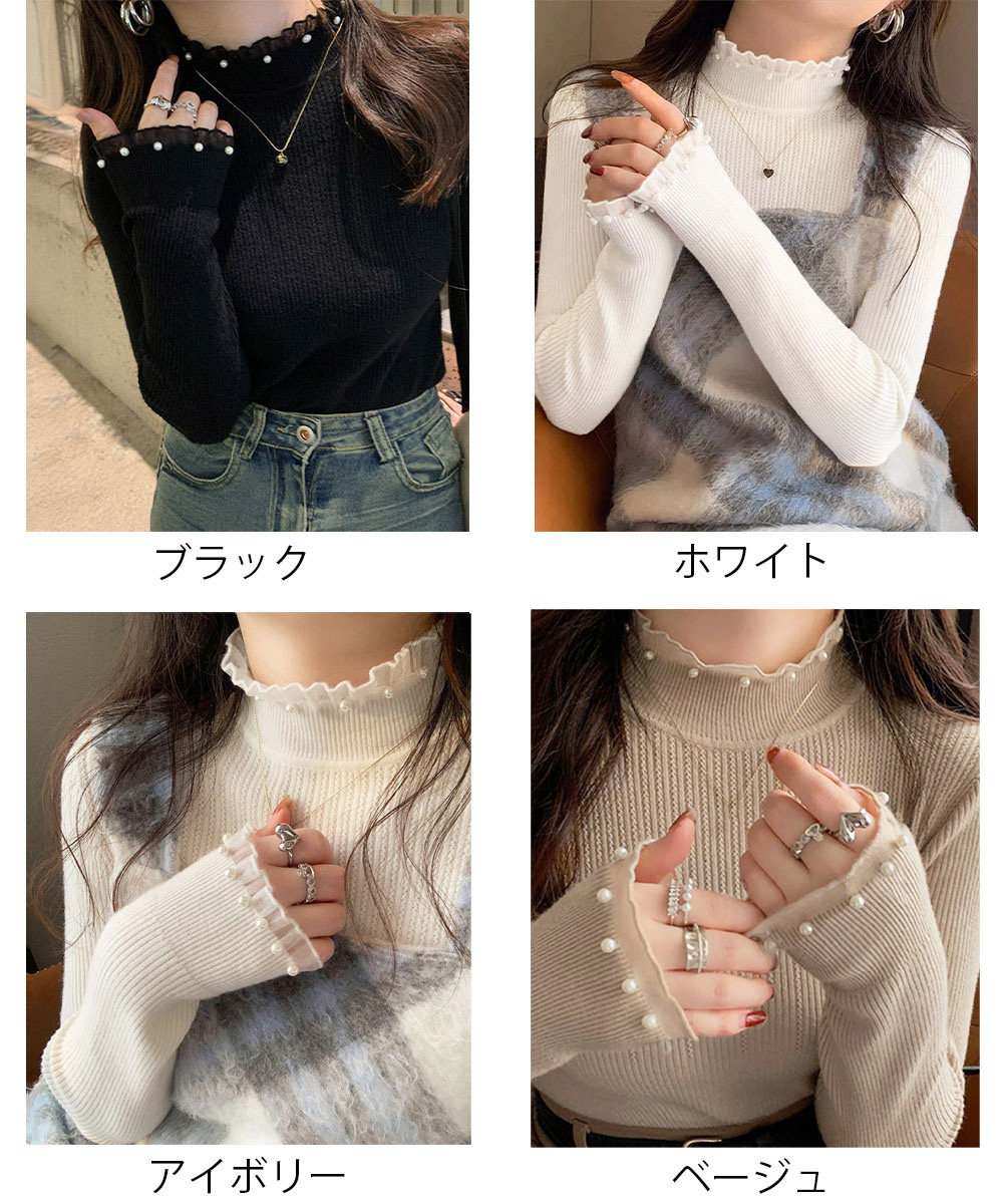 メロウフリルニットトップス レディース 大人上品 パールディテールニットインナー フェミニン ストレッチニット肌触り良い 柔らかいニットソー 韓国風セーター無地 プルオーバーニット パールをあしらったフェミニンな印象のリブニットトップス。 首元と袖口のメロウフリルデザインが、さりげなく女性らしさを引き立てる。 柔らかく伸縮性のある素材で、フィット感がありながらも快適な着心地。 スカートやデニムはもちろん、ジャンスカやジャケットのインナーとしてもおすすめ。 素材:ポリエステル75%+アクリル25% カラー:ブラック/ホワイト/アイボリー/ベージュ サイズ:ワンサイズ 着丈:約57cm 肩幅:約27cm 袖丈:約54cm ゆき:約67.5cm 身幅:約33cm 胸囲:約66-120cm 裏地:なし 伸縮性:あり 透け感:淡色のみ若干あり ※ニット素材の為、伸縮具合によっては編みに隙間を感じる場合があります。