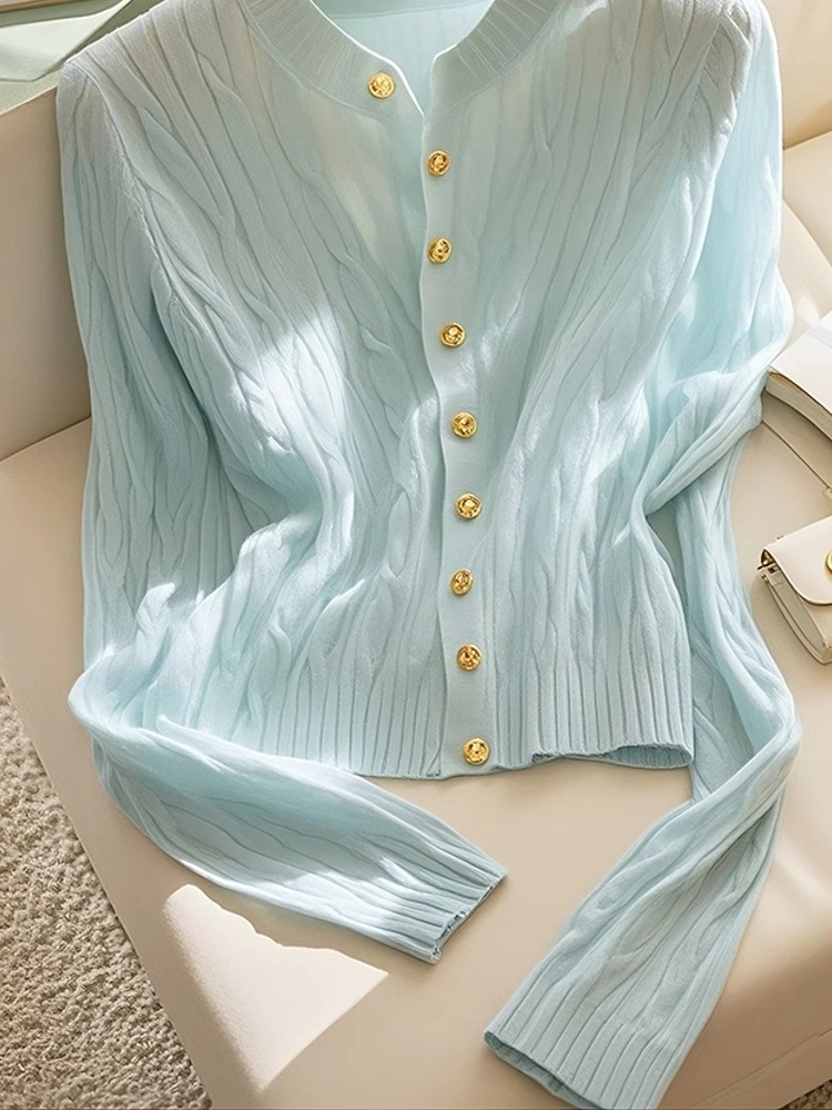 美しいミントグリーンと金ボタンが大人の品格を演出します。