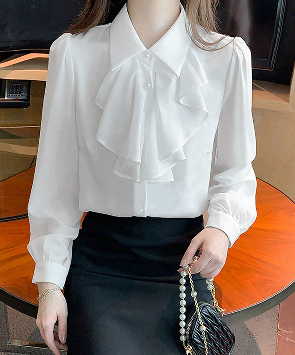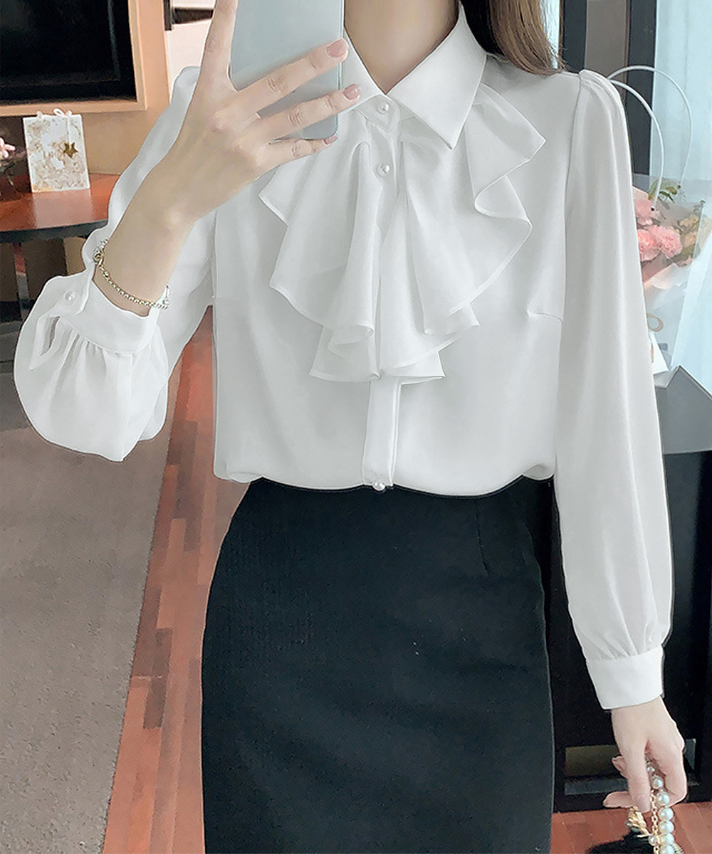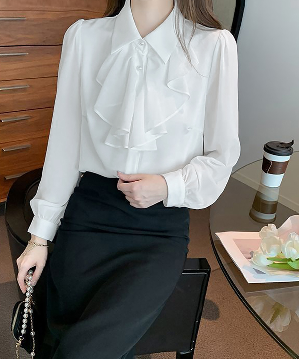 30代ファッションにぴったりの上品なフリルリボンブラウス。
